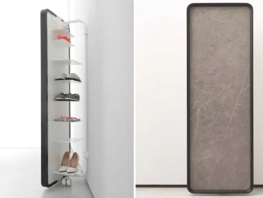 Casamania & Horm con Backstage ci mostrano un mobile specchio con contenitore personalizzabile, con ripiani inclinati si trasfoma in un capiente portascarpe.