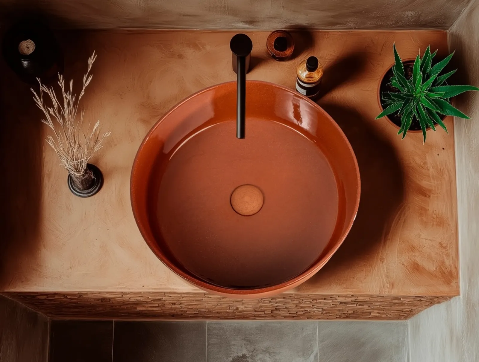Versione red per il lavabo della collezione Index Red di Cipì in argilla refrattaria, tornito a mano, con smalti lucidi e vetrificati all’esterno, cerato ed impermeabilizzato. Diametro di 42 cm, altezza di 16.