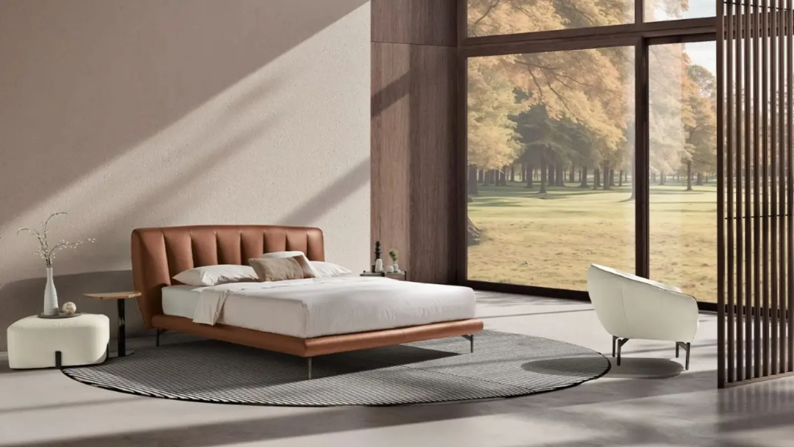 Si distingue per le proporzioni equilibrate e le eleganti cuciture verticali sulla testata il letto Domus di Turri. Ogni dettaglio è pensato per conferire una forte identità e trasformare la camera da letto in un ambiente dal fascino intramontabile.