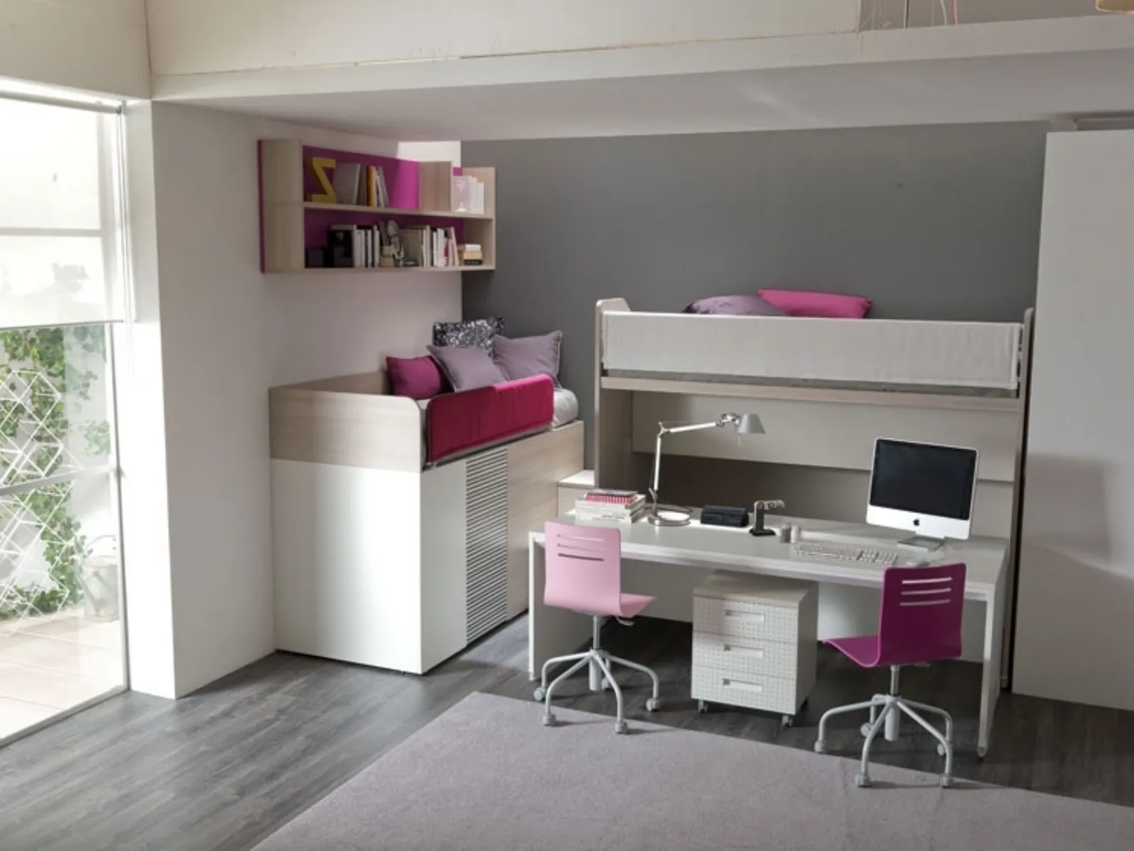 Alto valore estetico e funzionalità nella soluzione Container & Castello di Dielle: una proposta originale e creativa che trasforma la camera dei ragazzi in un luogo accogliente e immediatamente accessibile. In pochi metri quadrati è possibile disporre di tre soluzioni letto scorrevoli, dotate di spazi sorprendenti, come il Letto Container, la cabina armadio, fondamentale per organizzare al meglio lo spazio dei ragazzi, dove riporre abiti e oggetti anche ingombranti, che non riuscirebbero a trovare altra collocazione e la salita dotata di cassetti contenitori. La zona dedicata allo studio è strutturata con un’ampia libreria e una razionale scrivania ed è realizzata pensando alle esigenze dei ragazzi di oggi. La composizione Container & Castello è una soluzione completa, che permette di organizzare la cameretta in modo ideale e originale senza tralasciare la cura dei dettagli.