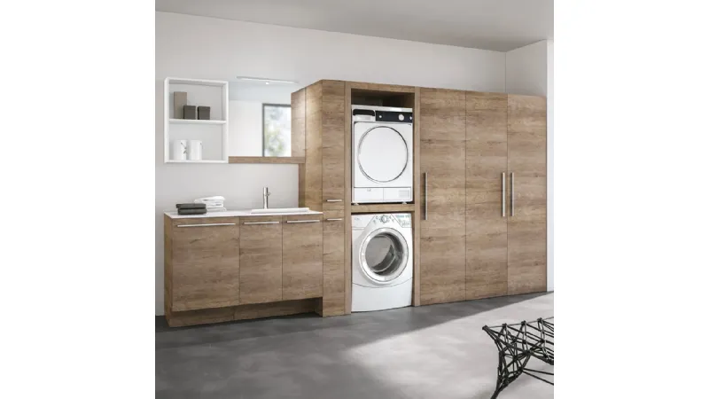 La stanza lavanderia, se si dispone di uno spazio sufficiente, diventa un vero e proprio luogo dove ospitare elementi di design, in grado di contenere ciò che non deve mai essere assente in una lavanderia, ossia una lavatrice, spazi e mobili in cui conservare asse da stiro, stendipanni, detersivi e altro ancora. Non devono mancare cesti per la biancheria sporca ed, eventualmente, un’asciugatrice. Nell’arredo della lavanderia non contano, però, soltanto delle soluzioni salva spazio, ma anche donare all’ambiente un’estetica piacevole, che sia in armonia con il resto della casa. A questo concetto si ispirano le composizioni della collezione Store di Hafro Geromin, di cui la n°1 in foto, che esprime la praticità della disposizione degli elementi unita alla bellezza e al calore del design, messo in luce dalla finitura melaminico Sherwood miele, dal top Greacryl bianco lucido, dalle maniglie griff e dalle ante e frontali cassetto realizzati con pannelli in conglomerato ecologico di legno idrorepellente. I cassetti, che hanno sponde in metallo, hanno una guida con estrazione totale e chiusura ammortizzata. Disponibili altri tipi di finiture e tonalità.