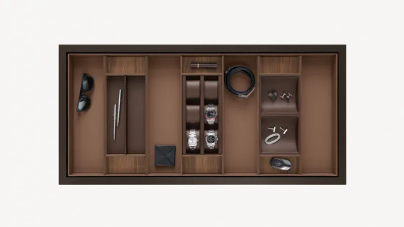 La perfezione del dettaglio, il ricercato accostamento di materiali e l’elevato contenuto tecnologico si esprimono anche negli interni di Cover freestanding e si concretizzano in soluzioni di grande valore estetico e costruttivo. Tra i vari accessori proposti per favorire l’ordine e l’organizzazione interna, mensole in vetro, aste portabiti, cassettiere estraibili, portascarpe, organizer ed elementi contenitori sospesi e su ruote. Il sistema si è recentemente arricchito poi di nuovi accessori: contenitori in essenza noce, separatore doppio, porta orologi, vaschetta concava e con fessure, disponibili nelle due finiture ecopelle castoro ed ecopelle argilla. Attenzione particolare merita la cassettiera sospesa a due cassetti, ancorata esclusivamente ai montanti strutturali delle ante. Il piano superiore è impreziosito da un profilo continuo in alluminio realizzato con la tecnologia esclusiva “folding” nel quale si inserisce il top per un effetto di grande pulizia formale. Le guide push ad estrazione totale di ultima generazione assicurano una perfetta funzionalità ai cassetti. Nei montanti anteriori e posteriori è integrata l’illuminazione a led opzionale, controllata da una centralina elettronica. La luce sul corrispettivo montante si accende all’apertura di ogni singola anta.