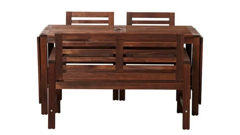 Ikea propone anche i piani tavolo, sia da interno, sia da esterno, i quali sono coordinabili con svariati generi di basi, come supporti in metallo, cavalletti ad A, gambe con rotelle e gambe con ripiani, per fare spazio a qualsiasi tipologia di oggetti, dagli utensili da cucina, alle stoviglie, alle riviste da leggere all’aperto, ma anche al PC. E’ possibile selezionare uno specifico piano tavolo e utilizzarlo in base alle esigenze. I top in legno massiccio sono ideali, ad esempio, come banchi da lavoro, o tavoli da pranzo o da giardino. Con l’assortimento Ikea di piani e gambe tavolo non è difficile sviluppare uno spazio per lavorare, per giocare o per cenare all’aperto. In foto, un’altra visuale del tavolo da giardino Applaro: grazie alle ribalte facili da piegare e da rimuovere, è possibile adattare velocemente la misura del tavolo alle tue esigenze. Il foro al centro del piano tavolo tiene fermo l'ombrellone. Per prolungarne la durata e conservare l'aspetto naturale del legno, il mobile è stato trattato con diversi strati di mordente per legno semitrasparente.