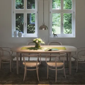 Il designer italiano Claudio Bellini ha progettato per Thonet l'elegante linea di tavoli in legno 1580, caratterizzata dagli spigoli arrotondati del piano che poggia a filo sulla struttura del tavolo, dando vita ad un’estetica leggera ed elegante. Le gambe sottili dalla forma leggermente incurvata verso l'esterno conferiscono alla contemporaneità del tavolo un'impronta caratteristica.
