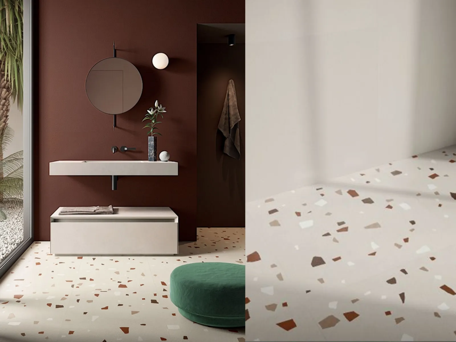 - Il terrazzo di cemento in stile veneziano è ormai tornato prepotentemente di moda all’interno degli spazi che ricercano eleganza e stile unico. In foto proponiamo di Italgraniti la collezione Nuance: effetto cemento arricchito da frammenti eterogenei nella forma e nel colore, leggermente riflettenti. La superficie risulta “morbida” e antiscivolo grazie a nuove tecnologie che aumentano l’attrito della piastrella, fattore estremamente utile in uno spazio umido come il bagno appunto. Queste superfici continue (grazie anche alle grandi dimensioni delle lastre (sino a 120x260 cm) e mosse, per la presenza dei frammenti policromatici, si sposano bene con pareti smaltate e colorate. È fatto obbligo che la tinteggiatura riprenda una delle tonalità delle schegge;