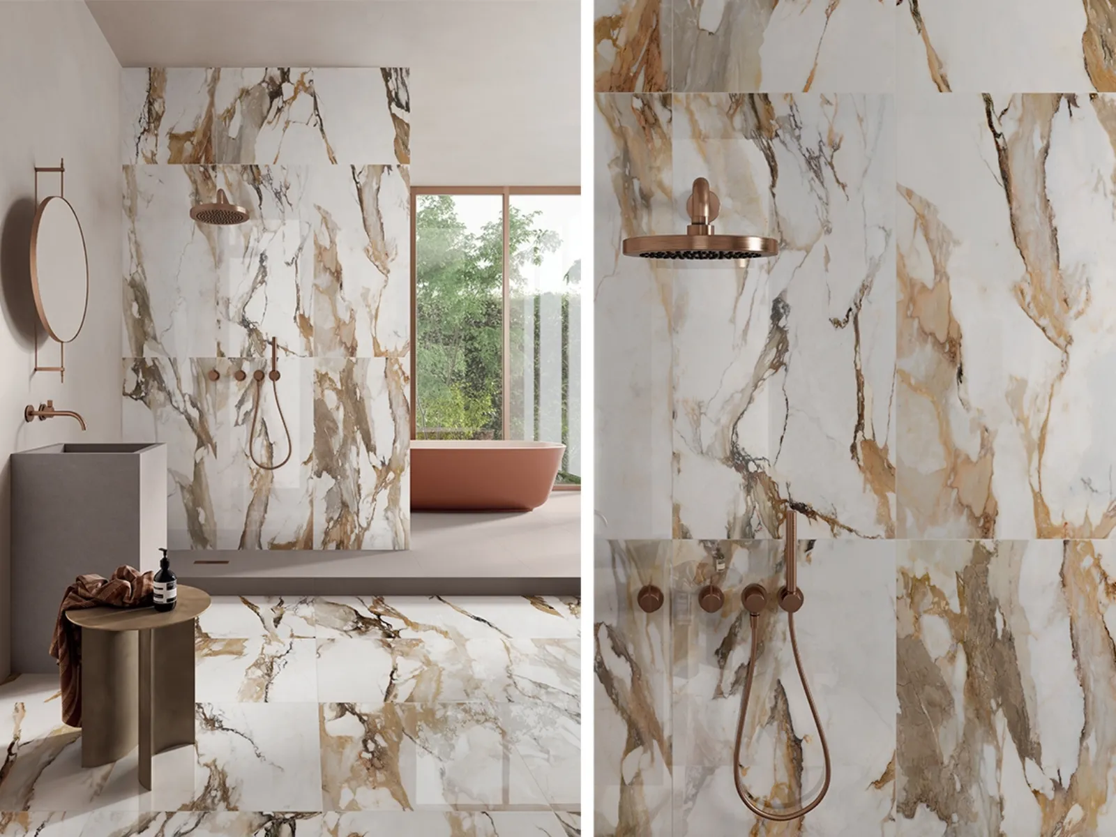 - come suggerimento si consiglia la posa in opera a tutt’altezza, per un effetto totalizzante e d’impatto. Per chi cerca estrema raffinatezza ed un’eleganza senza confronti si consigliano piastrelle dalla finitura glossy, estremamente lucida e brillante, dal sapore antico. Un esempio? Ce lo presenta Ceramiche Keope con la collezione 9Cento in cui vengono selezionati marmi pregiati e lussuosi e palladiane dalle geometrie d’altri tempi, tra rigore e naturalità. Abbinamenti sofisticati di materiali e colori provenienti dal passato sono poi la ciliegina sulla torta per completare il progetto d’arredo (in foto la finitura Alba oro formato 60x120 cm: un calacatta italiano dalle sfumature dorate con punte di cipria e arancio);