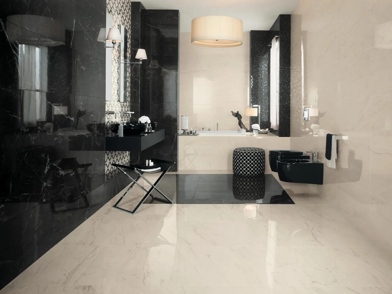 - le essenze più ricercate? Nero Marquinia e bianco Calacatta. La prima variante esprime austerità e fascino, la seconda un senso di classicità e purezza. Certo il nero va dosato in uno spazio confinato e spesso poco illuminato come il bagno, ma se scelto nella finitura brillante e bilanciato con una piastrella più chiara genera armonia ed eleganza. Il Calacatta presenta un fondo bianco con venature grigie, a volte tendenti al beige e si sposa con sanitari e ceramiche dalle forme ovali e sinuose, in perfetto stile classico. La collezione in gres Marvel Pro di Atlas Concorde seleziona pietre suntuose e raffinate come il marmo nero Saint Laurent e il più chiaro e diafano Cremo Delicato, entrambi nella finitura lappata estremamente lucente che richiama i marmi anticati (nella gallery);