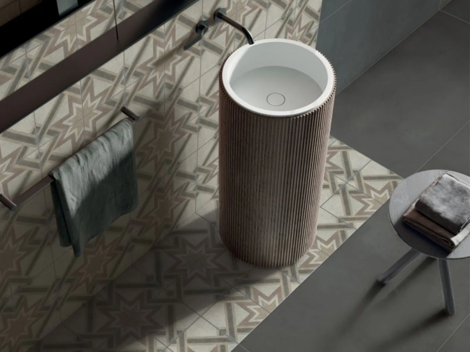 - forme: grandi lastre sì ma anche formati mini d’antan: quadrati, rettangolari ed esagonali, bellissimi se impiegati a 360 gradi in un bagno di piccole dimensioni, altrettanto scenografici se utilizzati come tappeti decorativi in un ambiente più ampio e arioso. Tra i grandi revival c’è anche l’effetto tridimensionale della piastrella esagonale proposto da Tonalite con la collezione Examatt. Creativo ed eccentrico è l’effetto di profondità creato dall’alternanza forte e decisa del bianco e del nero e del prisma che genera profondità e stile unico (in foto la piastrella Examatt Tredi Grigio). L’abbinamento a parete necessita di sobrietà e il contrasto tra geometrie rigide e serrate e ceramiche sinuose e rotondeggianti è di sicuro effetto;