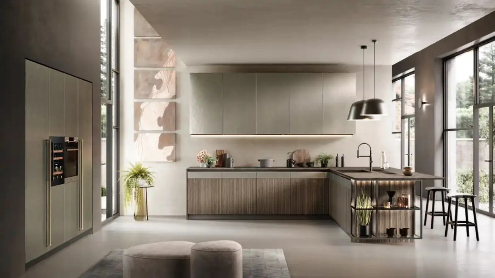 City di Stosa è una cucina moderna con anta telaio in legno di rovere termostrutturato disponibile in diverse tonalità. È ampio il tavolo penisola laterale.
