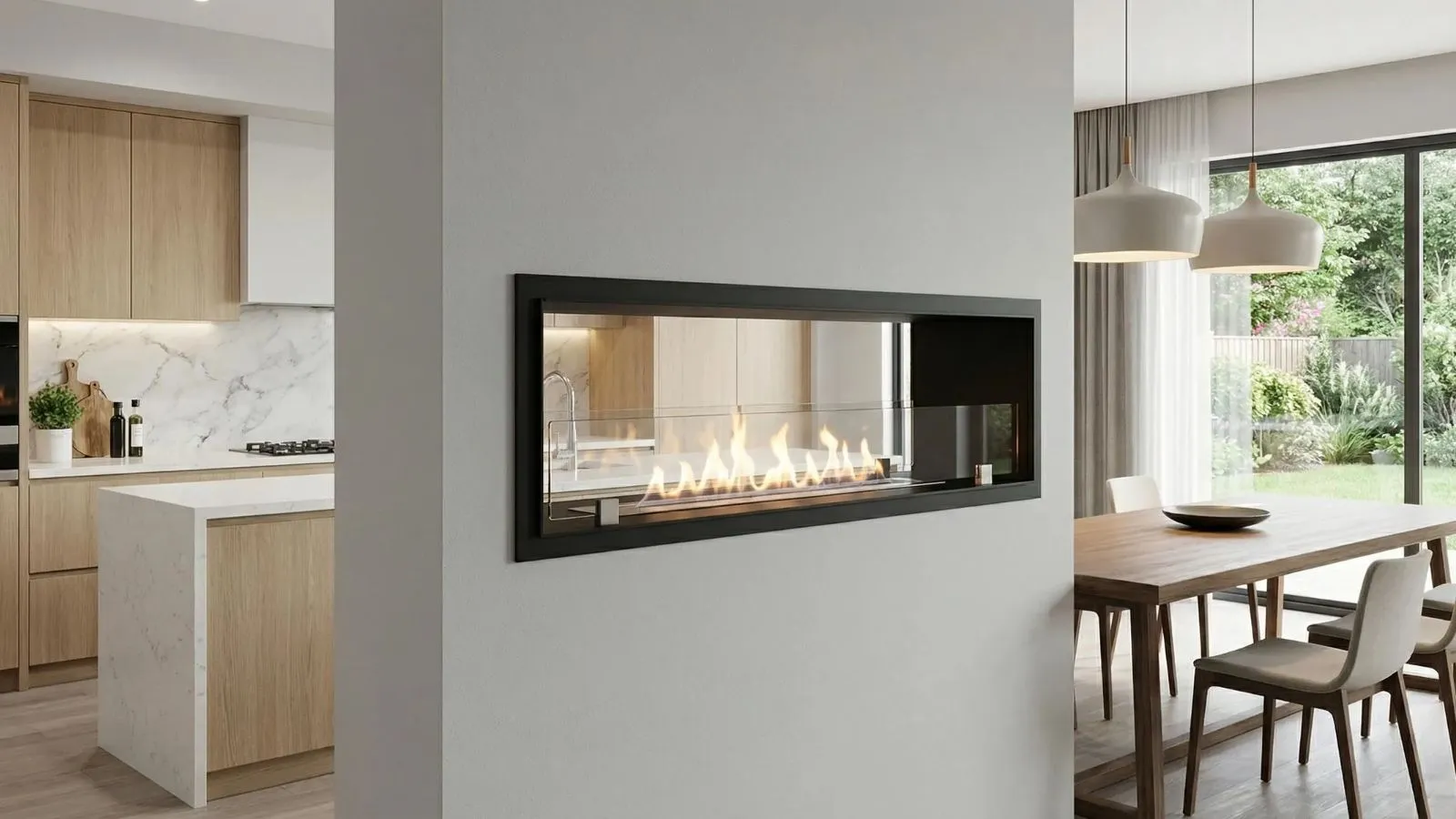 L'inserimento di un camino bifacciale offre l'opportunità di separare aree funzionali diverse senza rinunciare alla continuità visiva. Tipicamente, viene incassato in una parete divisoria, che può essere in cartongesso ignifugo o muratura. creando una separazione fluida tra la zona relax e la cucina oppure l'ingresso. Il camino passante diventa protagonosta nella confugurazione "a isola", diventando il punto focale attorno al quale ruota l'intero ambiente cucina-soggiorno.