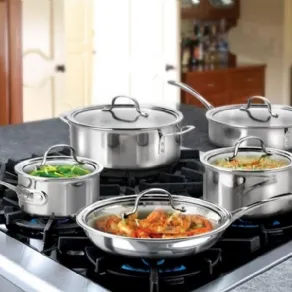 A parte i “must have” in legno come il cucchiaio, gran parte degli utensili da cucina è in acciaio. Certo, da qualche tempo a questa parte si fa parecchio sentire la “concorrenza” di altri materiali come la ghisa e la porcellana (in declino invece il rame e l’alluminio), tuttavia l’inox è ancora il più utilizzato nella produzione di pentolame e attrezzi da cucina. Merito della sua solidità, durata, dell’elevata resistenza alla corrosione e della facilità con cui si pulisce. Ha però qualche difetto, primo fra tutti la bassa conducibilità termica, a causa della quale il calore non viene distribuito in modo uniforme: il cibo sul fondo della pentola riceve molto più calore rispetto a quello che si trova più in superficie e di conseguenza c’è il rischio che si attacchi o si bruci. Rischio che, comunque, appare sensibilmente diminuito da quanto si utilizzano i rivestimenti in politetrafluorotilene (teflon), valida sostanza antiaderente. Si tenga inoltre presente che l’acciaio può cedere particelle di metallo se viene a contatto con composti acidi, dunque è meglio cucinare i pomodori e le salse agrodolci in pentole di altro tipo. Cambiando genere, ottime sono le ciotole in metallo per mescolare gli impasti di vario tipo: non c’è paragone con la plastica. Durano molto di più e inoltre l’impasto stesso si stacca facilmente dalle loro pareti, dunque la fatica diminuisce insieme ai tempi di preparazione. E la plastica è via via spodestata anche per quanto riguarda lo scolapasta. In acciaio inox, quest’ultimo è decisamente più comodo e funzionale. E l’acciaio ha il primato in riferimento agli attrezzi da cucina, cominciando dai coltelli e finendo con i mestoli.