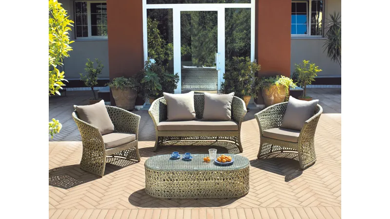 Design attuale per il set Antalya di Greenwood , salotto in cui le linee rette che disegnano divano, poltrone e tavolino si incrociano senza ordine apparente nell'originalissimo intreccio crazy. Al color tortora dei mobili fanno da contrappunto i cuscini grigi e il piano in vetro nero del tavolino. Linee più classiche ma rivisitate da una trama tutta nuova, ottenuta con wicker piatto, per gli altri due set di Greenwood. Nel set Gibilterra invece l'intreccio paglia del wicker si presta a inaspettati giochi di luce che ne mettono in risalto il raffinato color avana. Cipro (foto sopra il titolo) di Greenwood si contraddistingue per l'intreccio ottagonale della fibra piatta di 25 millimetri, che alleggerisce visivamente e ingentilisce l'intera composizione.