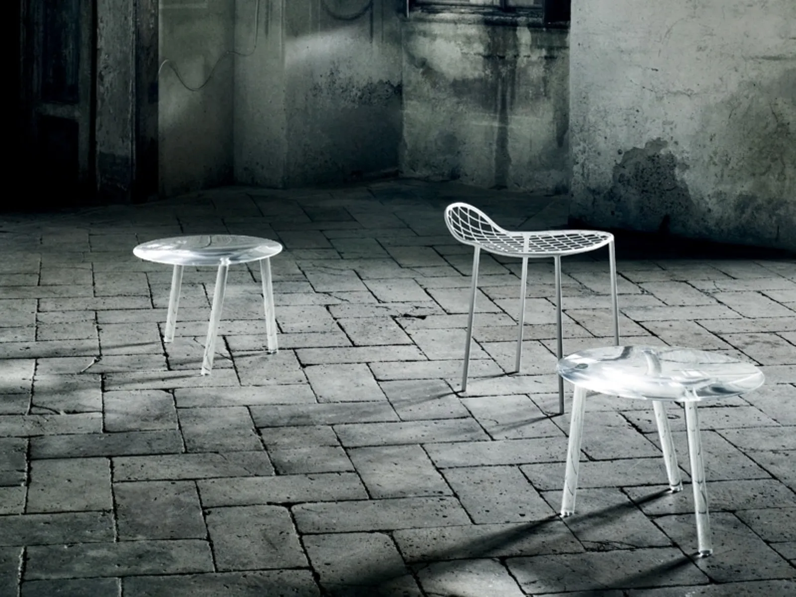 Family Chair è la collezione di 5 sedie in acciaio dallo straordinario effetto ottico amplificato, per oggetti leggeri, fruibili nella loro armonia della zona giorno e che allusivamente sembrano essere frutto della deformazione ottenuta dall’effetto lente di Drop Table.